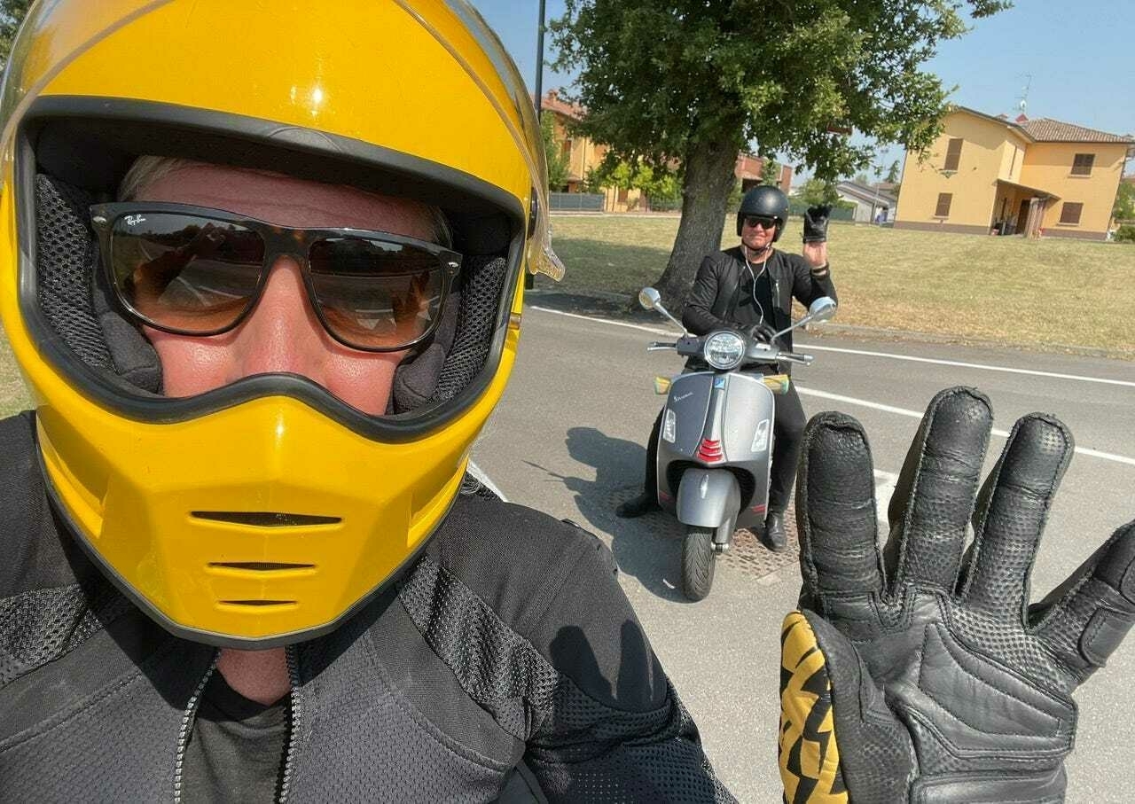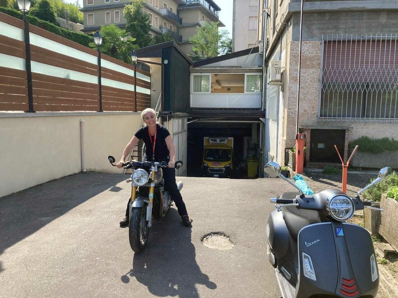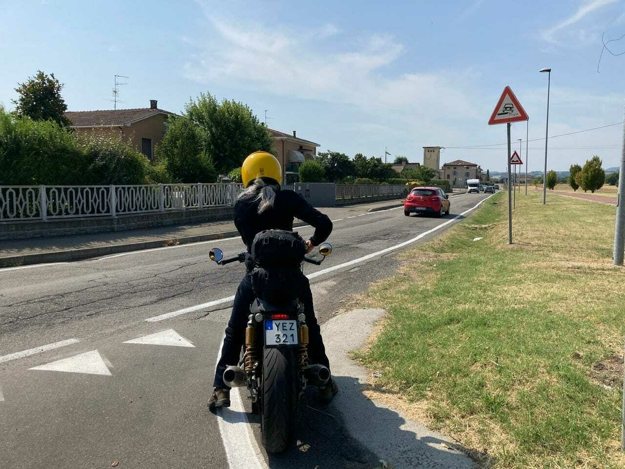 Vi checkade motvilligt ut från vårt hotell i Tabiano. Hit kommer vi åka igen. När vi skulle hämta ut hojarna höll mozzarellabilen på att lasta ur. ”Ska jag flytta mig?” frågade chauffören. ”Nej då.” svarade Caroline och baxade ut sin Thruxton ur boxen med några millimeter tillgodo. Jag körde upp för den branta uppfarten först och Caroline formligen dansade uppför backen, efter det att chauffören ropat ”Sådär låter en riktig motorcykel!”.