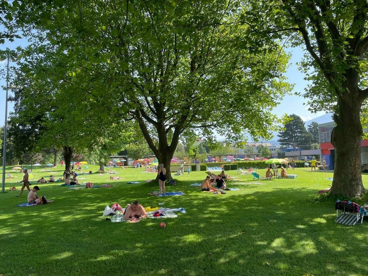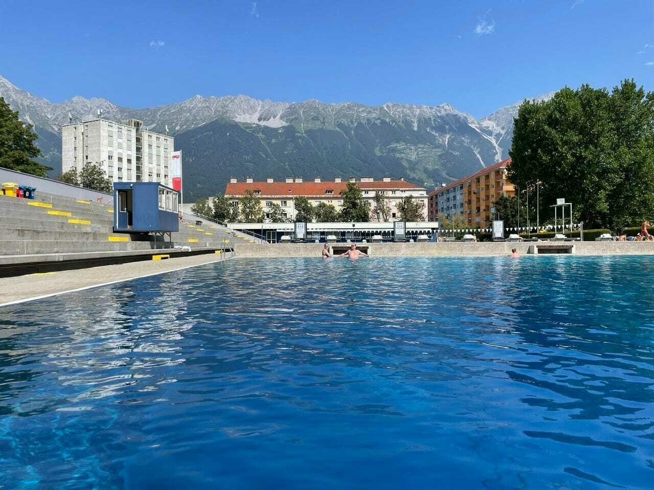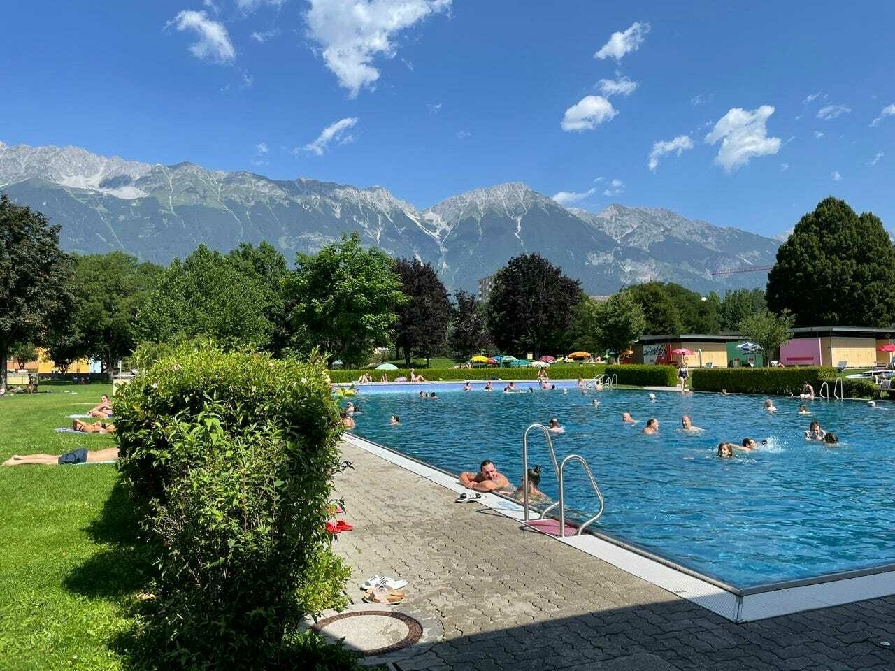 Efter frukost gick vi tillbaka till hotellet för att packa och checka ut. Vi lämnade väskorna i bagagerummet och tog en lagom lång promenad till Innsbrucks offentliga friluftsbad, Freibad Tivoli.