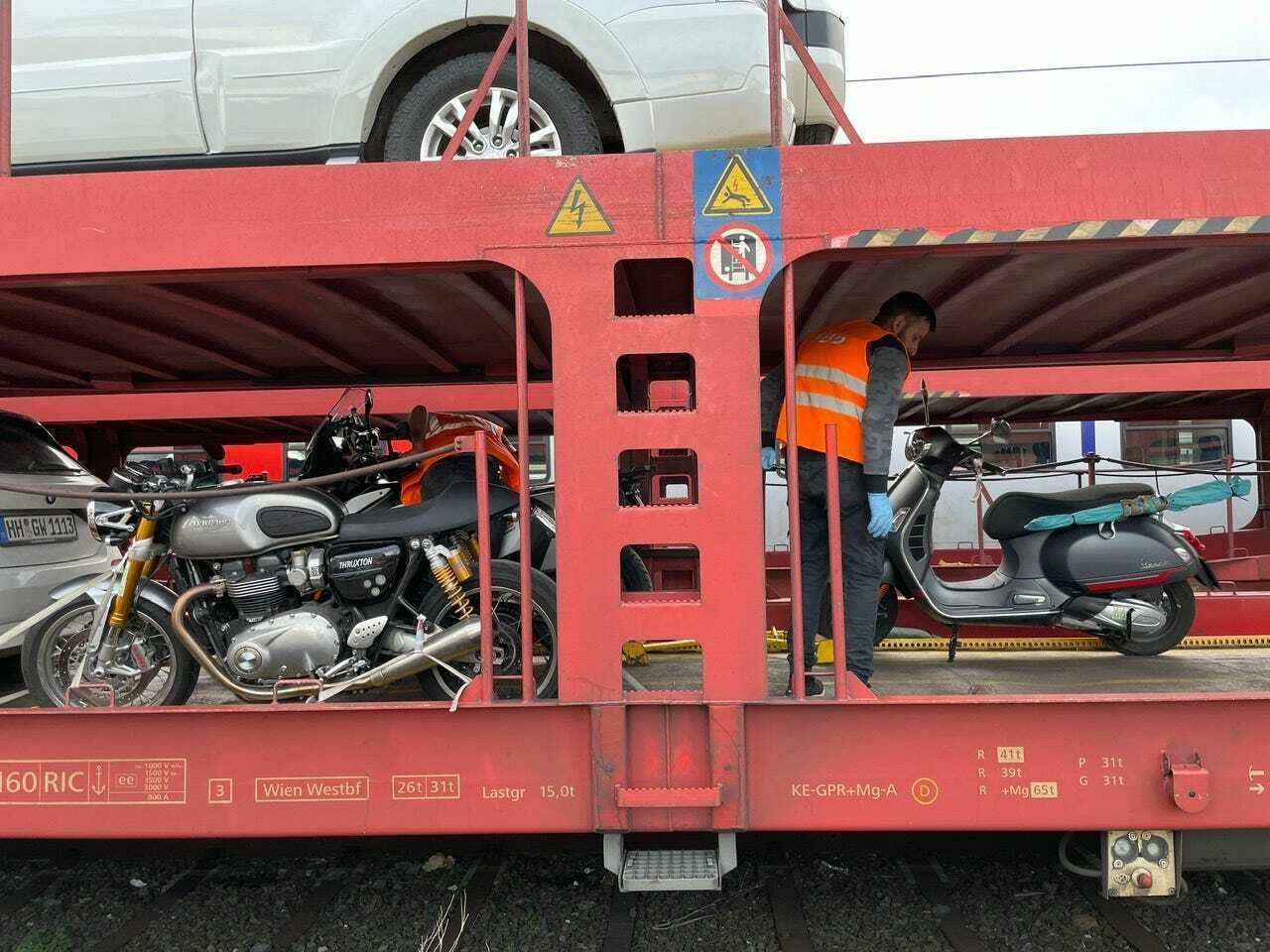 Och motorcyklarna lastade på AutoZug:et. Vänligen notera det turkosa badparasollet som vi köpte på Korsika.