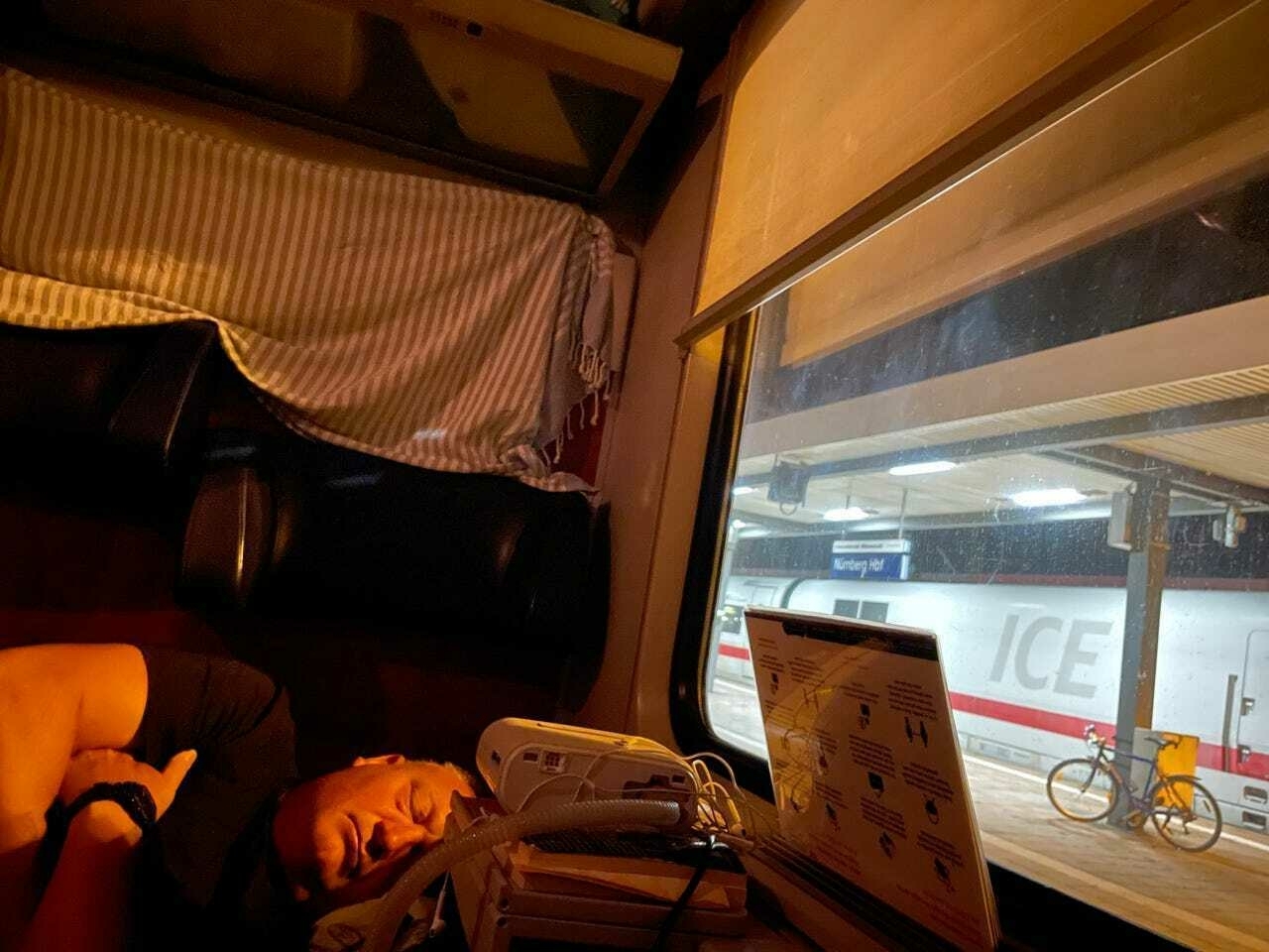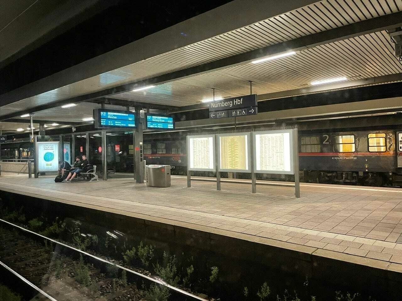 Tåget gick till slut från Innsbruck. Kraftigt försenat rullade tåget iväg medan åskan rullade mellan bergen. 04:28 passerade vi Nürnberg vilket Caroline dokumenterade.