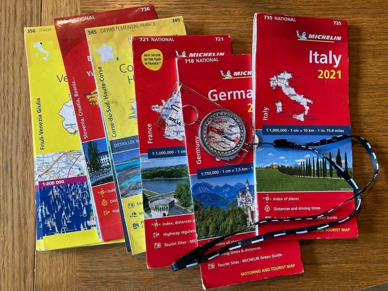 Kartor. Vi har använt fysiska papperskartor till all distansnavigation. Över ett glas vin eller en kopp te har vi gemensamt studerat kartan inför nästa dags körning och skrivit ”roadbook” (anvisningar) på papperslappar i A6-format. I tätorter har vi växlat mellan att använda mobiltelefonens GPS-navigering eller att bara köra ”på känn”.