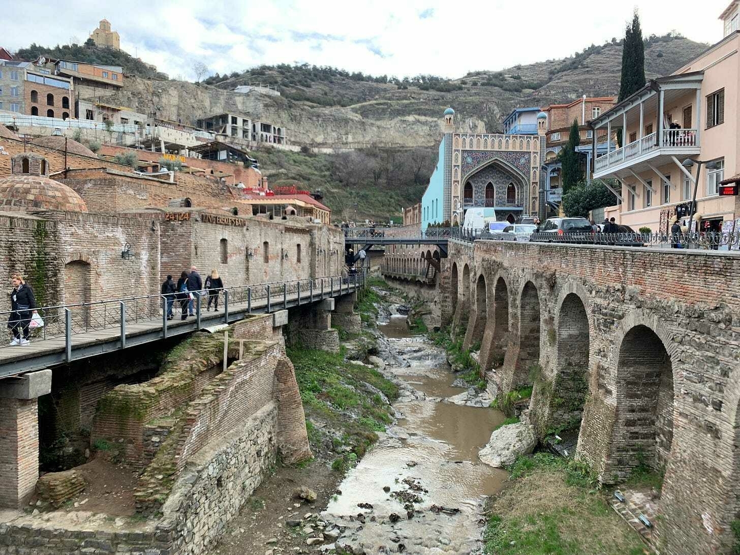 Samtidigt är Tbilisi en snäll stad. Folk är hjälpsamma, vänliga och har tålamod. Detta är min fjärde resa hit sedan 2019 och kontrasterna är märkliga. De flesta gamla bostadshus har fasader där putsen trillat av. Trottoarerna och gatorna är i ett skick som ingen från Norden skulle acceptera - jag skrattar åt tanken att ta med en delegation tillgänglighetskonsulter från Sverige hit, inte ens världens bästa viner (georgiska kveriviner) skulle kunna döva deras panikångestattacker. Många Tbilisibor, särskilt i min ålder, ser lite luggslitna ut. Inte den rena ”Sovjetmisärsgarderoben” jag såg i Sovjetunionen under 80-talet, men en sorts öststatskänsla över klädseln.